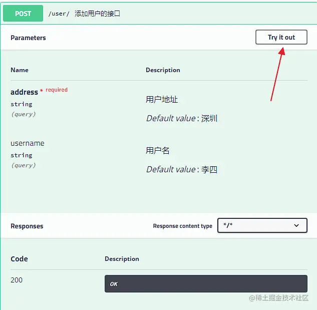 可以看到,接口的参数,参数要求,参数默认值等等统统都展示出来了,参数类型下的query表示参数以key/value的形式传递,点击右上角的Try it out,就可以进行接口测试: