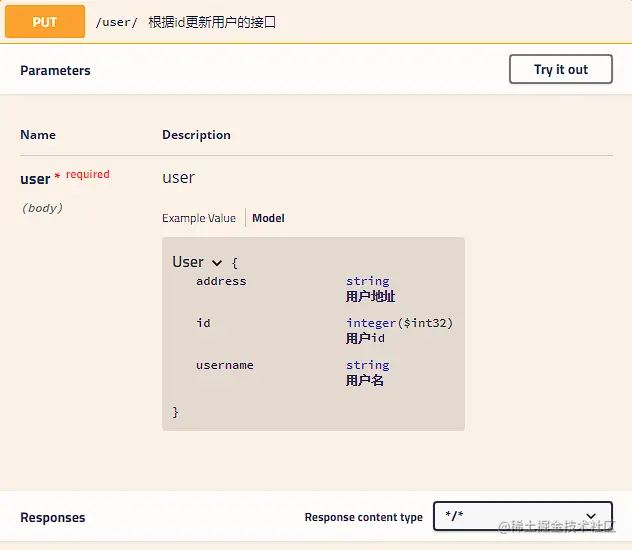 如果参数是一个对象(例如上文的更新接口),对于参数的描述也可以放在实体类中。例如下面一段代码: