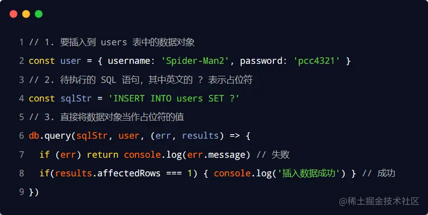向 users 表中新增数据, 其中 username 为 Spider-Man,password 为 pcc321。示例代码如下: