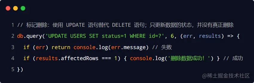 当用户执行了删除的动作时,我们并没有执行 DELETE 语句把数据删除掉,而是执行了 UPDATE 语句,将这条数据对应的 status 字段标记为删除即可。
