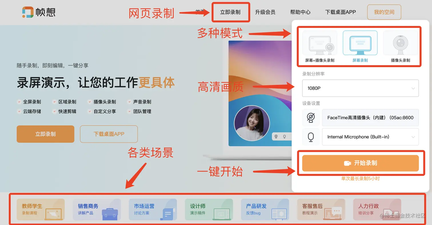这是一款网页端的在线录屏软件,百度搜索关键词“帧想” 就会立刻跳转到网页端,点击“立即录制”,即可开始录制。