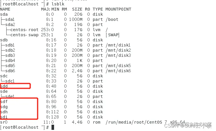 可以看到我们sdd、sdf、sdg、sdh、sdi都是可以用的物理磁盘,接下来我将以sdd磁盘来做例子。