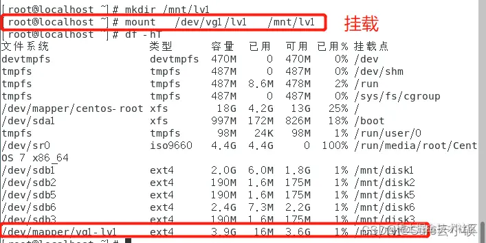 /dev/mapper/vg1-lv1 ext4 3.9G 16M 3.6G 1% /mnt/lv1
