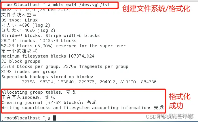 创建文件系统:mkfs.ext4 /dev/卷组名/逻辑卷名