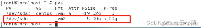 这个时候sdd磁盘已经转换成了物理卷可以通过pvs命令查看