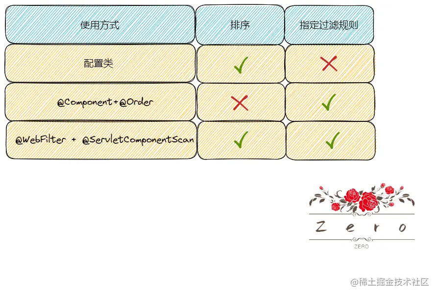 @Component+@Order这种配置方式,如果不用设置过滤顺序的话,@Order还能忽略掉 @WebFilter+@ServletComponentScan个人感觉用的比较少,感觉像是@SpringBoot为了兼容@WebFilter弄出来的- 所以总得来说,推荐使用配置类的方式,并且在过滤器中,离业务层接口比较远,应该做的是一些无关业务的操作,比如说字符集编码设置等等,同时,如果项目是前后端不分离的话,并且如果有这个需求的话,过滤器可以对静态资源进行过滤
