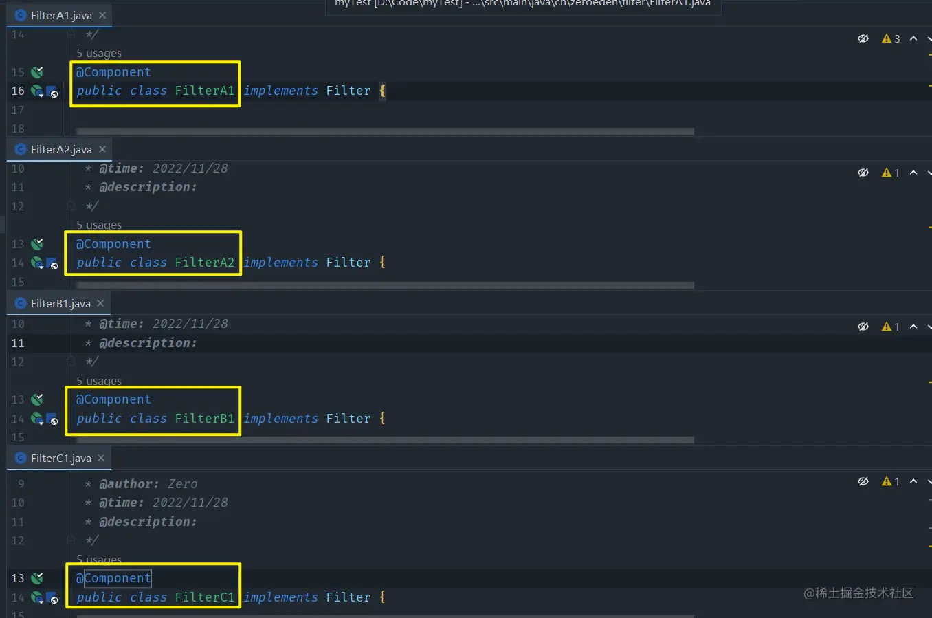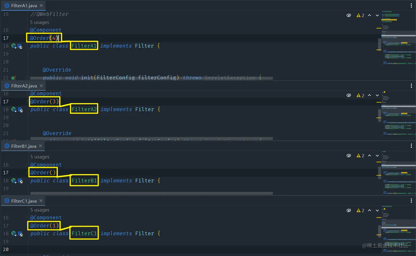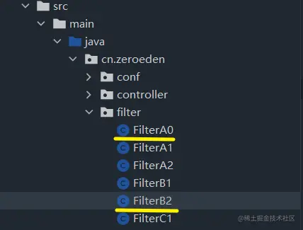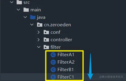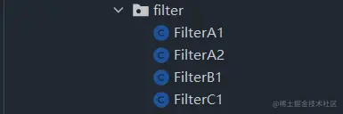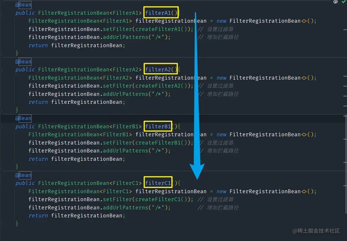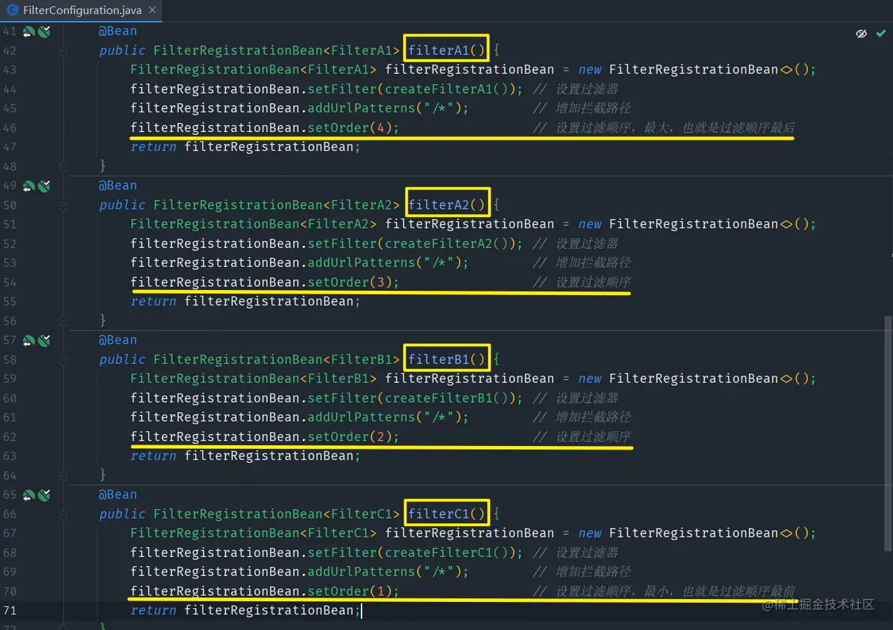 order值从大到小为FilterA1,FilterA2,FilterB1,FilterC1,按照order值越小,过滤排在越前的规则,也就是实际上过滤顺序该为FilterC1,FilterB1,FilterA2,FIlterA1 -