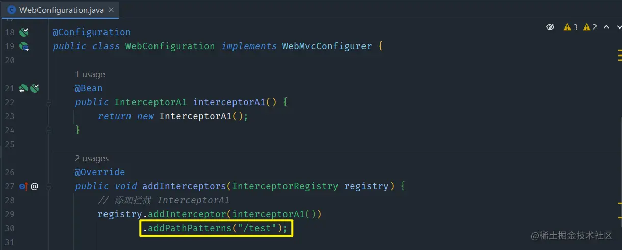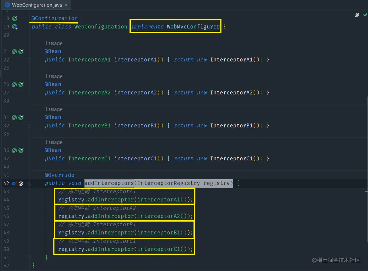 Interceptor是Spring框架自带的,所以说直接通过实现了WebMvcConfigurer接口配置类,重写addInterceptors(InterceptorRegistry registry)方法直接配置就好 -