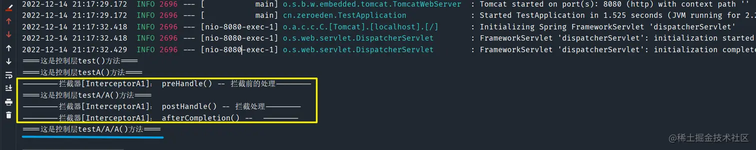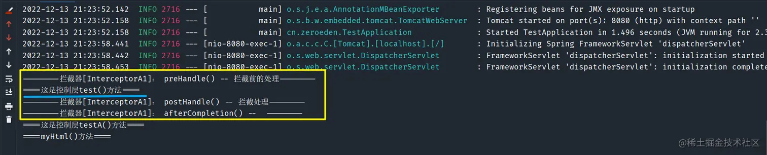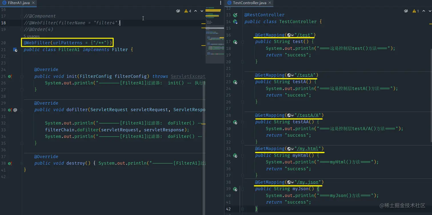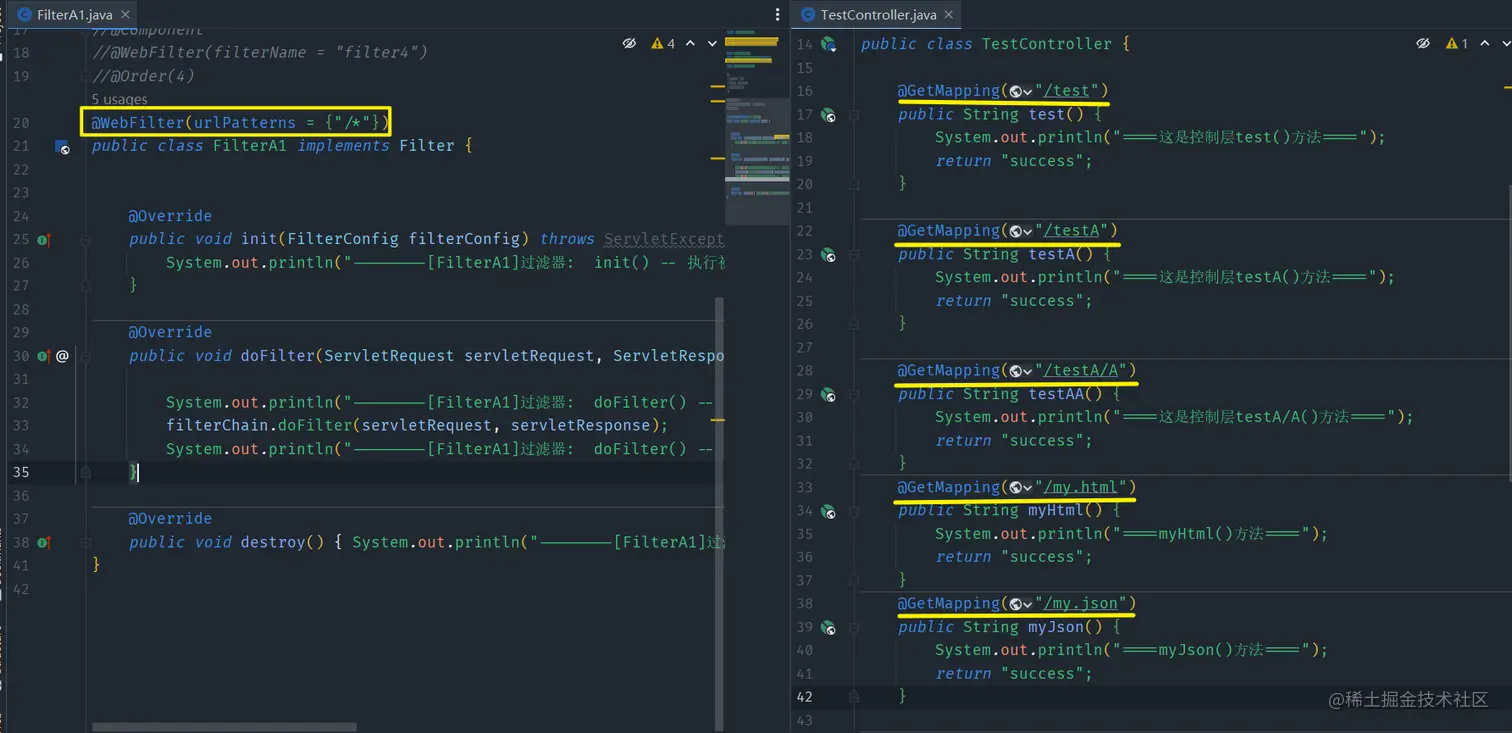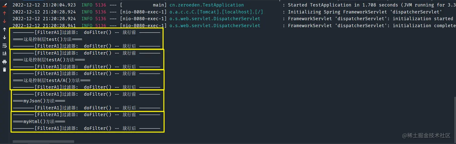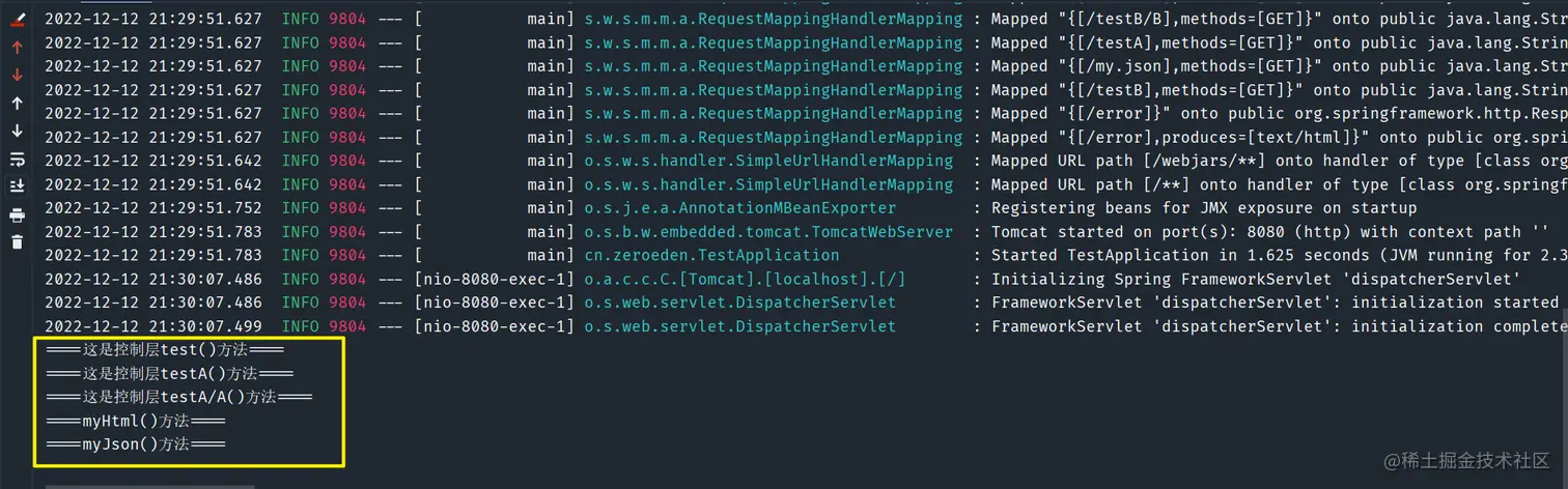 SpringBoot环境/** * @author: Zero * @time: 2022/12/9 * @description: */ @SpringBootApplication public class TestApplication { public static void main(String[] args) { SpringApplication.run(TestApplication.class, args); } } /** * @author: Zero * @time: 2022/12/9 * @description: 控制层 */ @RestController public class TestController { @GetMapping("/test") public String test() { System.out.println("====这是控制层test()方法===="); return "success"; } @GetMapping("/testA") public String testA() { System.out.println("====这是控制层testA()方法===="); return "success"; } @GetMapping("/testA/A") public String testAA() { System.out.println("====这是控制层testA/A()方法===="); return "success"; } @GetMapping("/testB") public String testB() { System.out.println("====这是控制层testB()方法===="); return "success"; } @GetMapping("/testB/B") public String testBB() { System.out.println("====这是控制层testBB()方法===="); return "success"; } @GetMapping("/my") public String my() { System.out.println("====my()方法===="); return "success"; } @GetMapping("/my.html") public String myHtml() { System.out.println("====myHtml()方法===="); return "success"; } @GetMapping("/my.json") public String myJson() { System.out.println("====myJson()方法===="); return "success"; } }