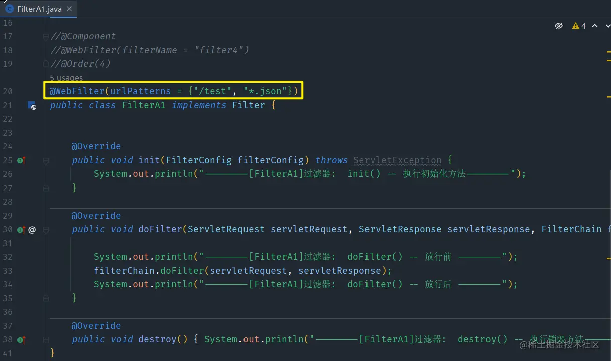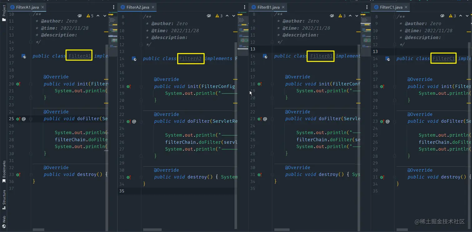 Filter实现代码模板如下/** * @author: Zero * @time: 2022/11/28 * @description: */ public class FilterA1 implements Filter { @Override public void init(FilterConfig filterConfig) throws ServletException { System.out.println("--------[FilterA1]过滤器: init() -- 执行初始化方法--------"); } @Override public void doFilter(ServletRequest servletRequest, ServletResponse servletResponse, FilterChain filterChain) throws IOException, ServletException { System.out.println("--------[FilterA1]过滤器: doFilter() -- 放行前 --------"); filterChain.doFilter(servletRequest, servletResponse); System.out.println("--------[FilterA1]过滤器: doFilter() -- 放行后 --------"); } @Override public void destroy() { System.out.println("--------[FilterA1]过滤器: destroy() -- 执行销毁方法--------"); } } -