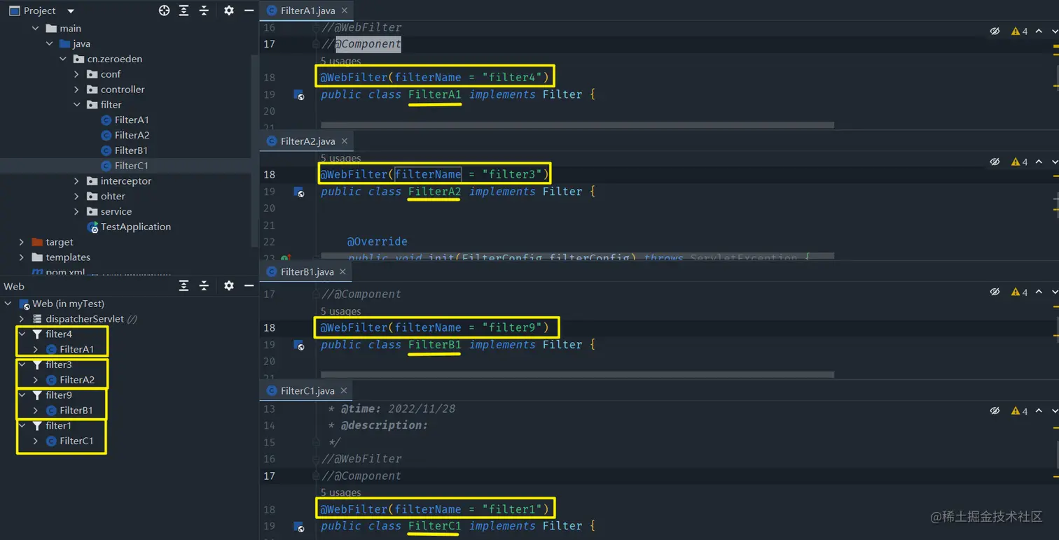 - 对于这种配置方式,默认还是按照比较类名的方式来决定过滤顺序(越小过滤顺序越前)
