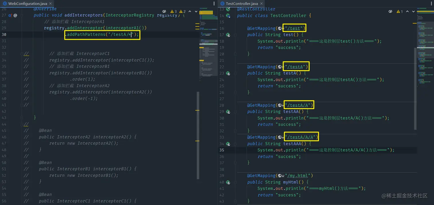 /testA/A时拦截器才拦截到,而/testA/A/A无效,也就证明结论是正确的(/*后面最多只能加一级路径,否则不生效) -