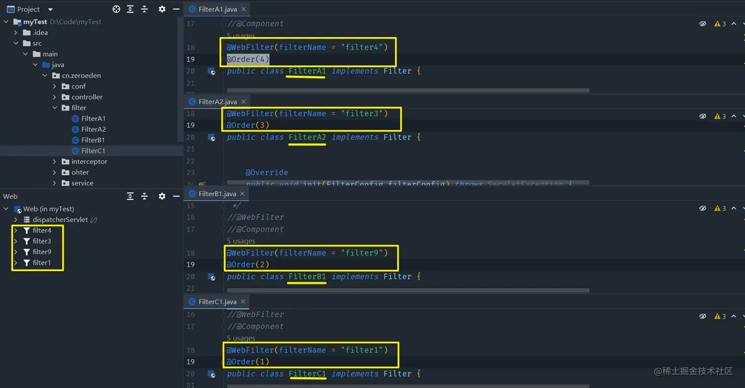 Filter,会按照注解@Order中的值来控制过滤顺序 - 如果说没有配置此注解,或者说配置的值相等,则会默认通过比较类名(越小过滤顺序越前)来决定过滤顺序