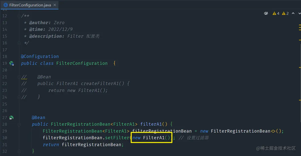 /** * @author: Zero * @time: 2022/12/9 * @description: Filter 配置类 */ @Configuration public class FilterConfiguration { @Bean public FilterA1 createFilterA1(){ return new FilterA1(); } @Bean public FilterA2 createFilterA2(){ return new FilterA2(); } @Bean public FilterB1 createFilterB1(){ return new FilterB1(); } @Bean public FilterC1 createFilterC1(){ return new FilterC1(); } @Bean public FilterRegistrationBean<FilterA1> filterA1(){ FilterRegistrationBean<FilterA1> filterRegistrationBean = new FilterRegistrationBean<>(); filterRegistrationBean.setFilter(createFilterA1()); // 设置过滤器 filterRegistrationBean.addUrlPatterns("/*"); // 增加拦截路径 return filterRegistrationBean; } @Bean public FilterRegistrationBean<FilterA2> filterA2(){ FilterRegistrationBean<FilterA2> filterRegistrationBean = new FilterRegistrationBean<>(); filterRegistrationBean.setFilter(createFilterA2()); // 设置过滤器 filterRegistrationBean.addUrlPatterns("/*"); // 增加拦截路径 return filterRegistrationBean; } @Bean public FilterRegistrationBean<FilterB1> filterB1(){ FilterRegistrationBean<FilterB1> filterRegistrationBean = new FilterRegistrationBean<>(); filterRegistrationBean.setFilter(createFilterB1()); // 设置过滤器 filterRegistrationBean.addUrlPatterns("/*"); // 增加拦截路径 return filterRegistrationBean; } @Bean public FilterRegistrationBean<FilterC1> filterC1(){ FilterRegistrationBean<FilterC1> filterRegistrationBean = new FilterRegistrationBean<>(); filterRegistrationBean.setFilter(createFilterC1()); // 设置过滤器 filterRegistrationBean.addUrlPatterns("/*"); // 增加拦截路径 return filterRegistrationBean; } } -