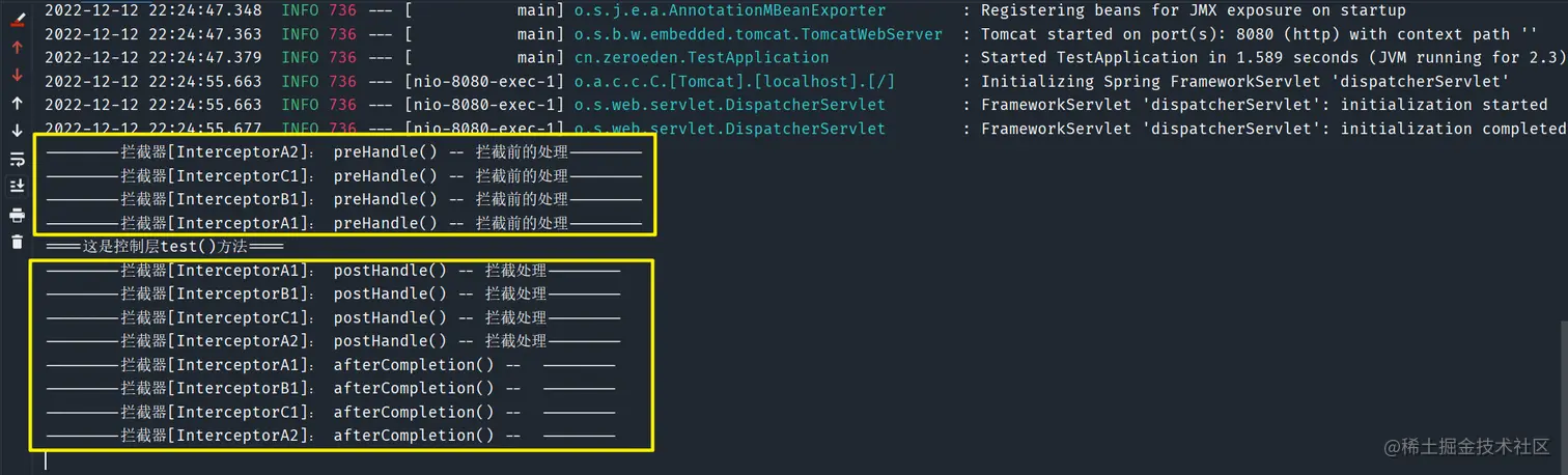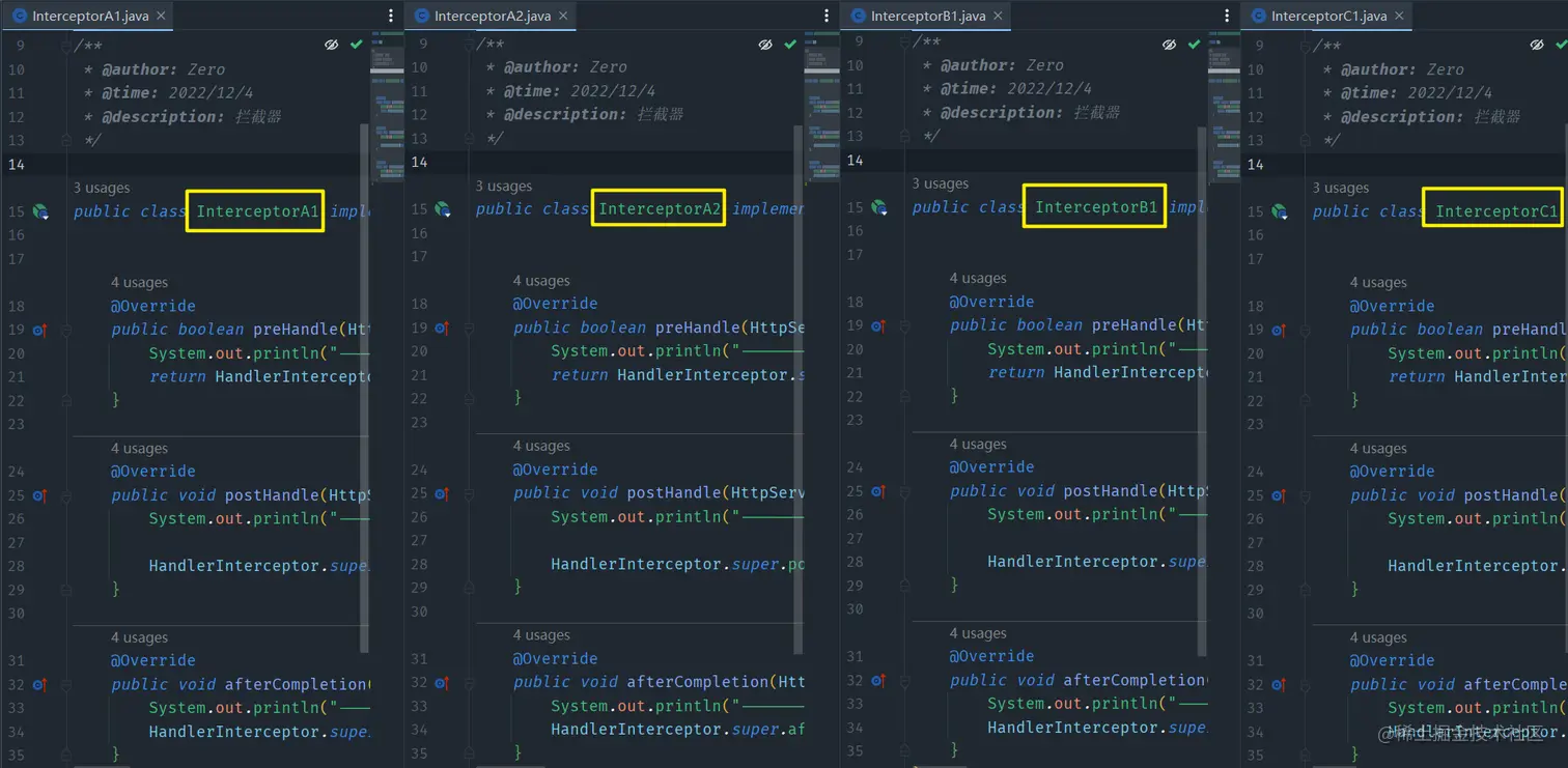 Interceptor实现代码模板如下/** * @author: Zero * @time: 2022/12/4 * @description: 拦截器 */ //@Component public class InterceptorA1 implements HandlerInterceptor { @Override public boolean preHandle(HttpServletRequest request, HttpServletResponse response, Object handler) throws Exception { System.out.println("--------拦截器[InterceptorA1]: preHandle() -- 拦截前的处理--------"); return HandlerInterceptor.super.preHandle(request, response, handler); } @Override public void postHandle(HttpServletRequest request, HttpServletResponse response, Object handler, ModelAndView modelAndView) throws Exception { System.out.println("--------拦截器[InterceptorA1]: postHandle() -- 拦截处理--------"); HandlerInterceptor.super.postHandle(request, response, handler, modelAndView); } @Override public void afterCompletion(HttpServletRequest request, HttpServletResponse response, Object handler, Exception ex) throws Exception { System.out.println("--------拦截器[InterceptorA1]: afterCompletion() -- --------"); HandlerInterceptor.super.afterCompletion(request, response, handler, ex); } } -