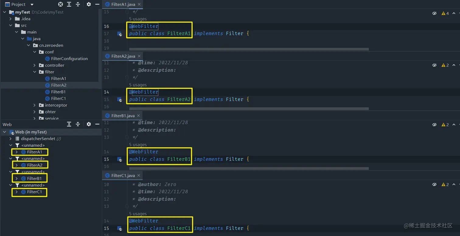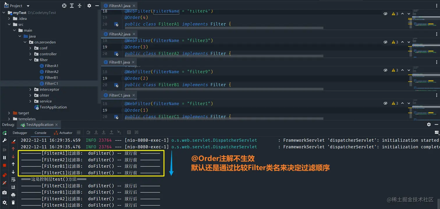 FilterA1,FilterB1,FilterC1,FilterA2,正如小结所说,证明小结是准确的(默认情况下是按照Filter的配置方法顺序去控制Filter的过滤顺序的) -