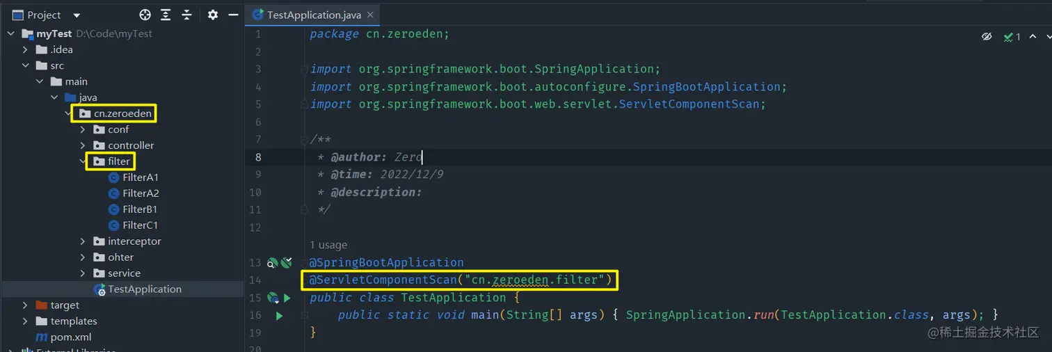Filter上加入注解WebFilter(标明这是个过滤器),以及在启动类上加入注解@ServletComponent,配置Filter的扫描路径