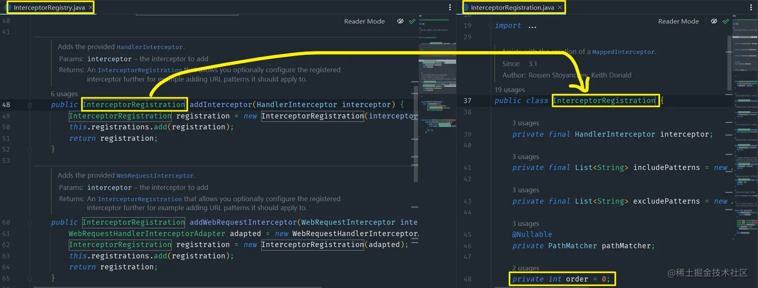 SpringBoot使用InterceptorRegistration类来统一封装Interceptor,其内部含有属性order用来设置拦截顺序,order值越小,拦截顺序排在越前(默认值为0) -