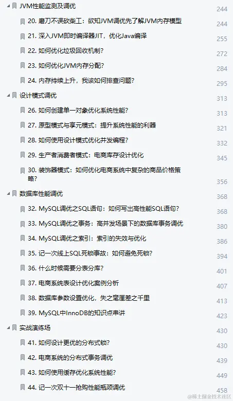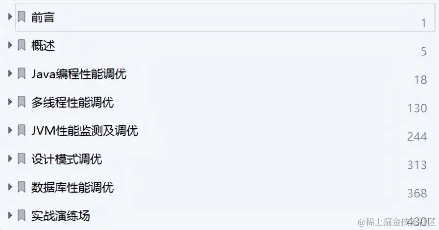 给大家分享一套 阿里 Java 性能调优手册。465页,涵盖Java编程性能调优,Java多线程性能调优,JVM性能检测及调优,设计模式调优,数据库性能调优,实战演练等。希望对大家学习Java有帮助。
