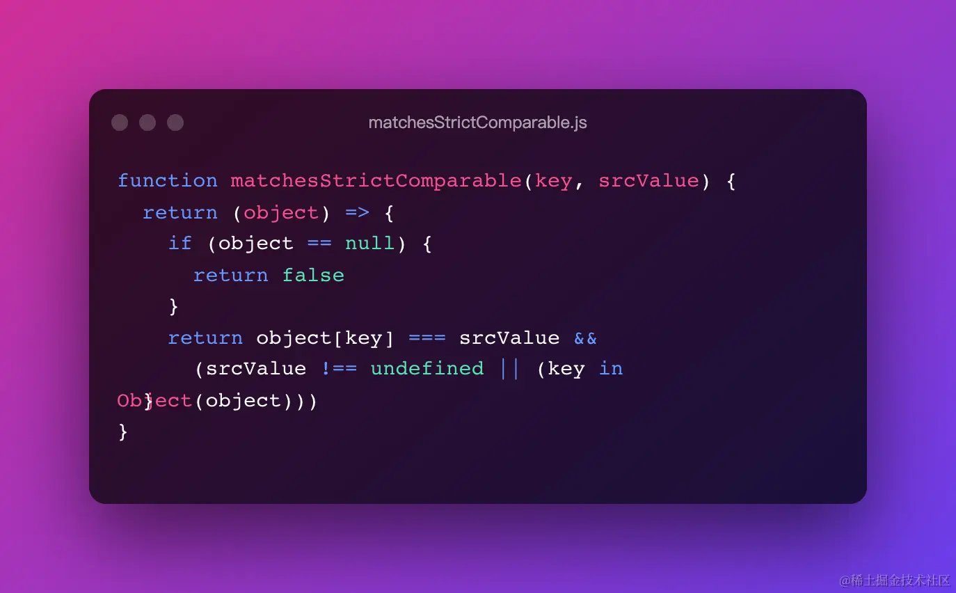 六.matchesStrictComparable函数:返回一个函数,这个函数接受一个对象,并判断object上的key是否和srcValue相等