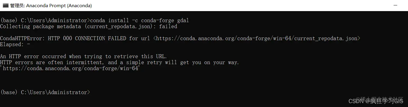需要注意的是,本文介绍基于conda install命令直接联网安装GDAL库的方法;这一方法有时不太稳定,且速度较慢。因此,如果有需要,大家可以通过换源或.whl文件的方法来安装,具体操作我们将在后期的文章中加以介绍。