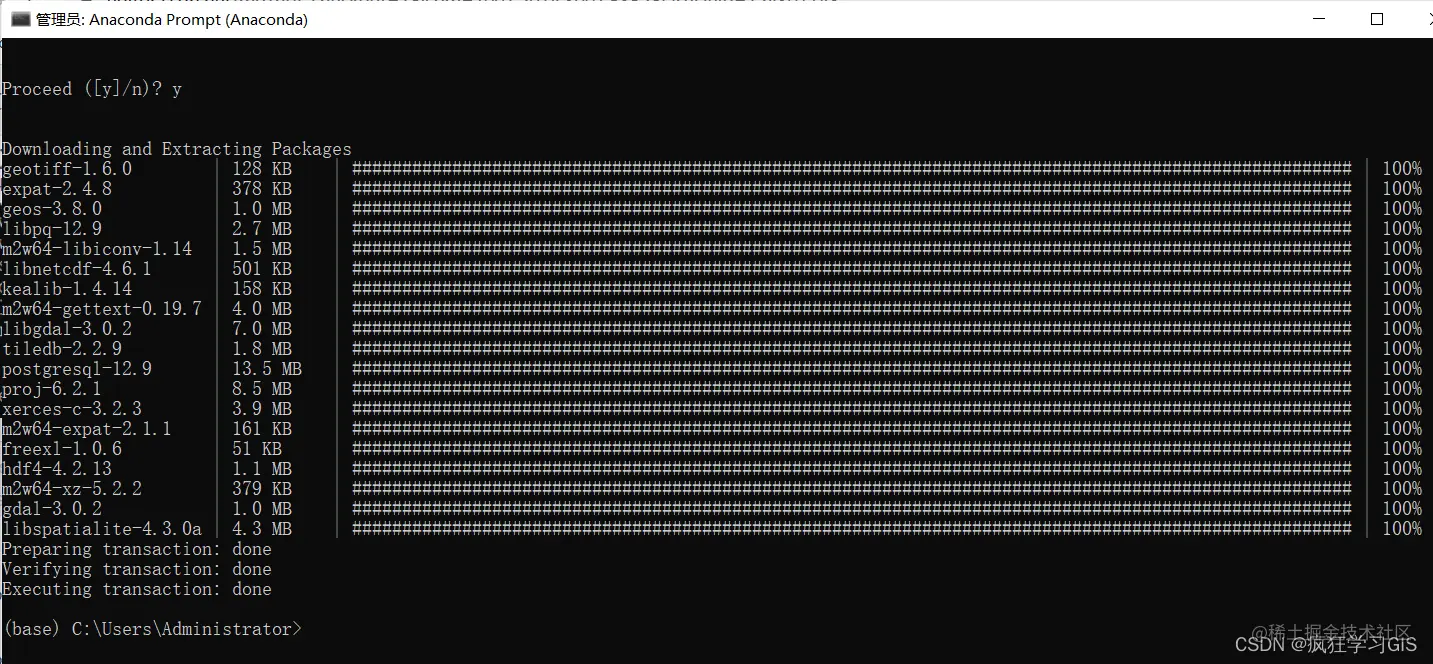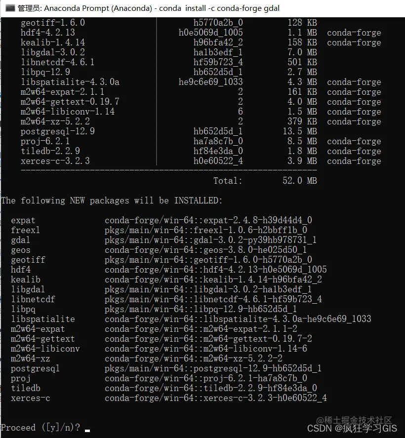 待系统找到GDAL这一模块的元数据后,我们输入y即可开始下载、安装的过程。