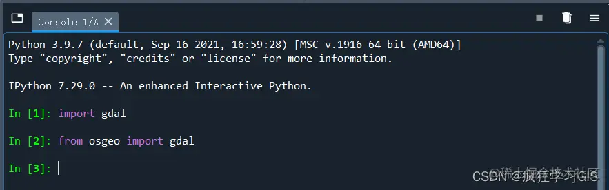 为了验证我们GDAL模块的安装是否成功,我们可以在编译器中尝试加载这一模块;若发现可以成功加载,则说明GDAL模块安装无误。