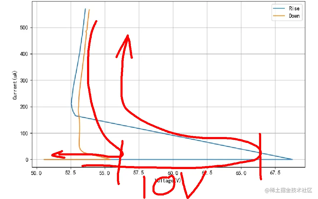 这是电压上升过程中测量的数据, 横坐标是电压,纵坐标是电流,单位是微安。 当电压超过68V的时候, 氖泡开始击穿, 并随着电压上升电流快速增加。 击穿后的电压为52V左右。 这是电压下降过程中的数据曲线, 随着电流下降,氖泡两端的电压也降低。 知道电压小于53V左右时,氖泡转为截止状态, 随着电压下降,电流始终为零。 这是将两个曲线绘制在同一坐标图上, 氖泡的击穿电压比较高, 转为截止的电压比较低, 两者之间相差10V左右。 这也是氖泡可以组成张弛振荡电路的关键特性。