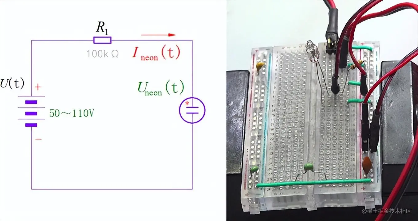 在看到一段氖泡闪灯电路视频中,UP主展示了仅仅依靠一个电阻、电容和氖泡构成的闪烁线路。 这是对应的电路。 这种电路起振的关键,需要依赖于氖泡的复阻抗特性,或者伏特特性中的滞回特性。 这是两种振荡器张弛振荡器,依赖于器件输入输出之间的回滞特性和复阻抗特性。 既然氖泡可以在电阻电容下振荡,说明它的击穿电压与保持电压之间也存在着差异,也就是回滞现象。