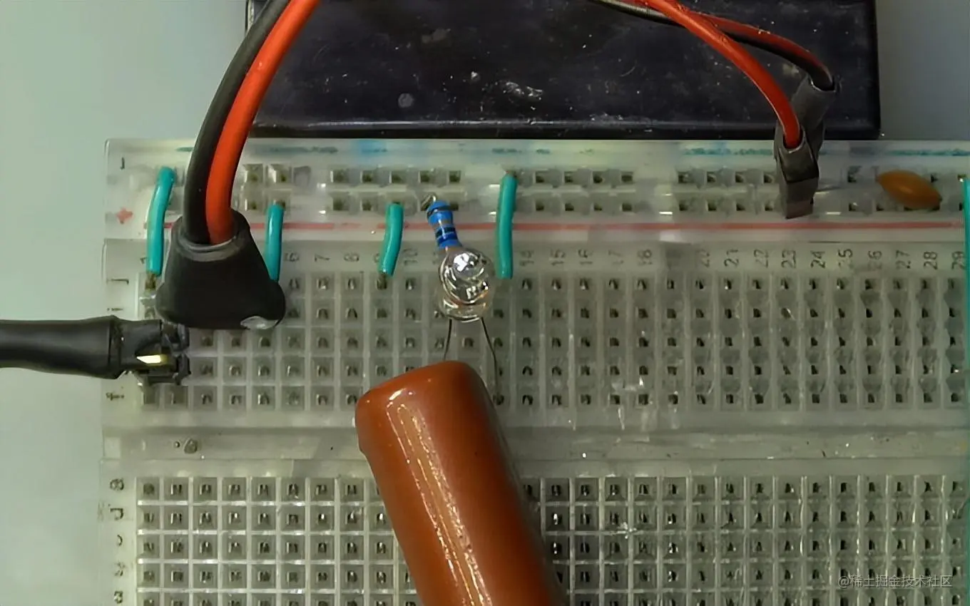 图1.1.1 面包板上的闪烁氖泡振荡电路