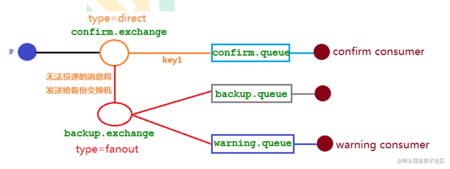 在 RabbitMQ 中,有一种备份交换机的机制存在,可以很好的应对这个问题。什么是备份交换机呢?备份