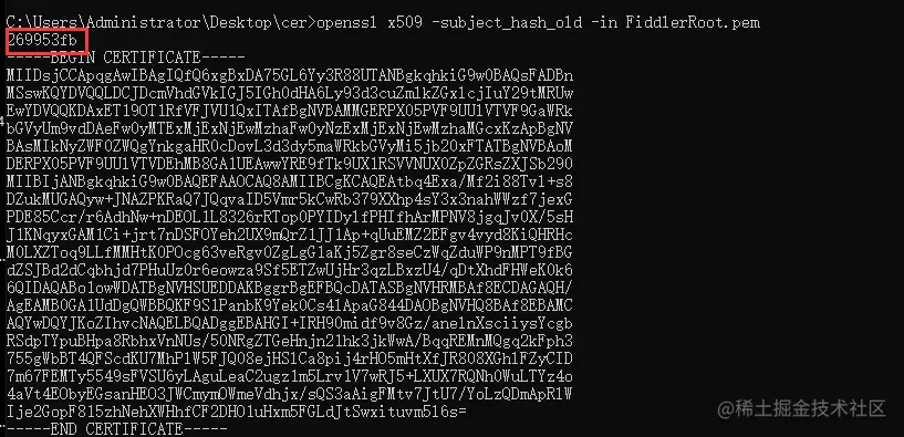 - 执行 openssl x509 -subject_hash_old -in FiddlerRoot.pem 获取第一行的hash 数值