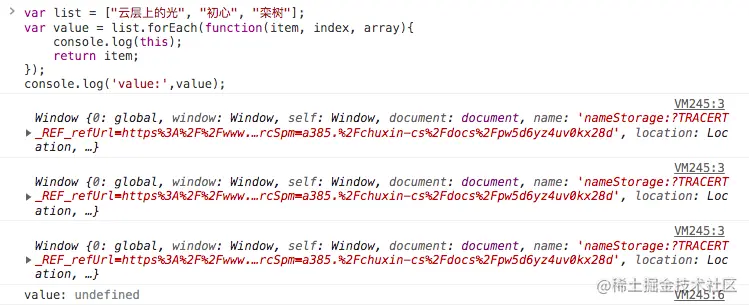 可以看到 this指向 window并且forEach没有返回值,返回值为 undefined