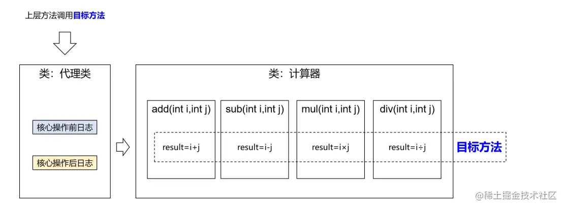 - 目标:被代理“套用”了非核心逻辑代码的类、对象、方法。