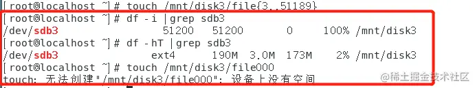 可以看到用dd if=/dev/zero of=/mnt/disk3/file1 bs=1M count=174命令将sdb3的空间填满,也就是把sdb3分区的块全部占用,这时候再创建文件依然是失败的。