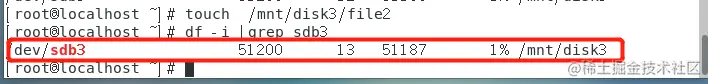 sdb3这个分区是挂载到disk3文件夹上的,所以可看到sdb3这个分区总共有51200个inode,已经用了12个,还有51188个可用,那么我在disk3目录下再创建一个文件来看看sdb3分区的inode节点数。