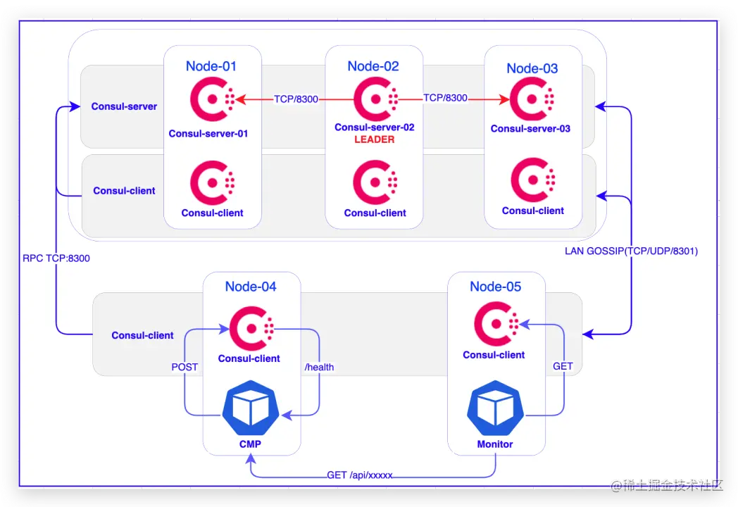 在改架构中,业务遇到过以下挑战: 1.Consul Cluster需要采用高可用部署,改组建需要投入额外投入进行维护。 2.业务部署在Kubernetes集群内,需以DaemonSet方式部署Consul Client至每个业务Node,当Node出现故障宕机,会出现应用注册脏数据,需手动处理,造成业务请求异常。