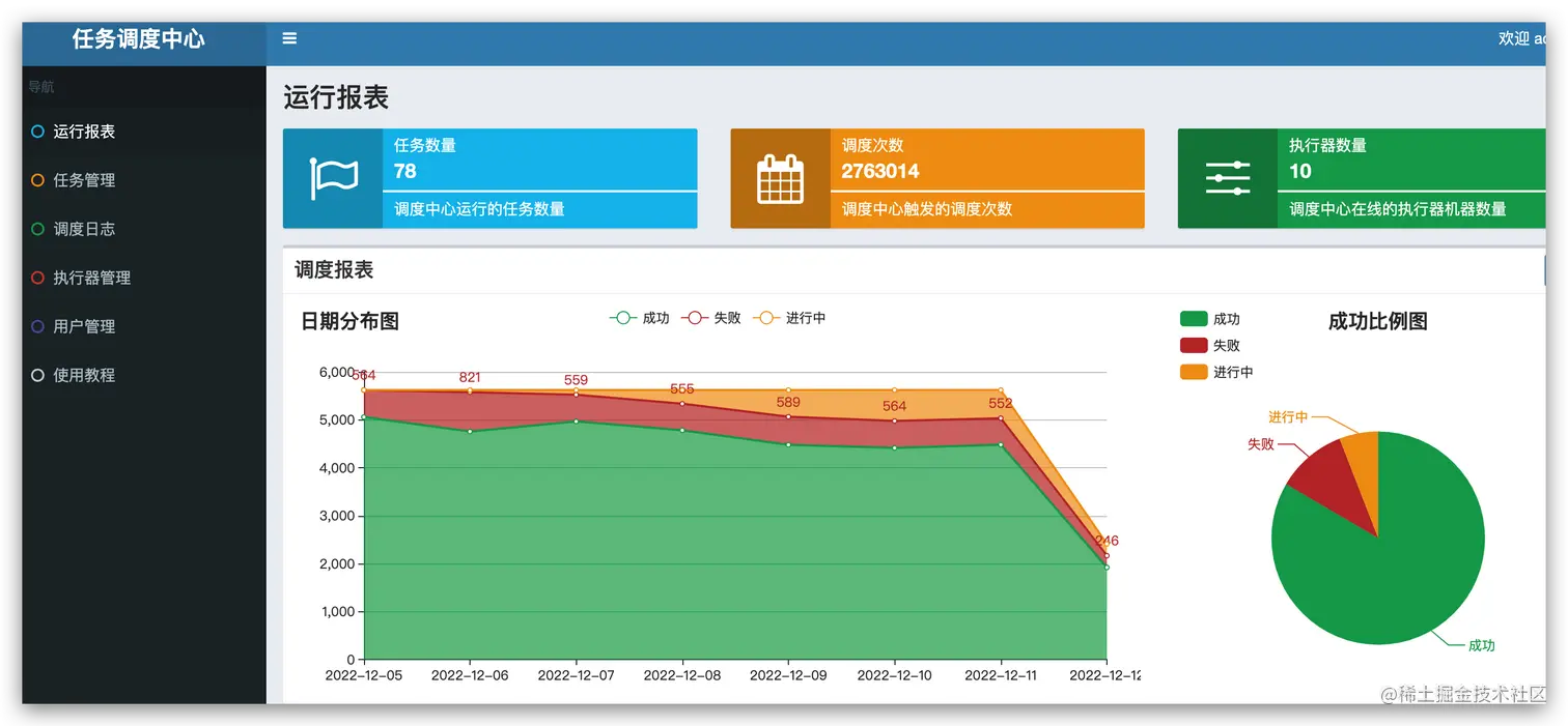 在平台中存在很对定时任务,存在多服务任务实现方式不一致,排错成本高,难以统一管控,针对此困境,进行集中化分布式任务调度平台改造,xxl-job中心式的调度平台轻量级,开箱即用,操作简易,上手快,与SpringBoot有非常好的集成,且监控界面就集成在调度中心,界面简洁,选取xxl-job做调度平台,调度中心:负责管理调度信息,按照调度配置发出调度请求,自身不承担业务代码。支持可视化界面,可以在调度中心对任务进行新增,更新,删除,会实时生效。支持监控调度结果,查看执行日志,查看调度任务统计报表,任务失败告警等等。执行器:负责接收调度请求,执行调度任务的业务逻辑。执行器启动后需要注册到调度中心。接收调度中心的发出的执行请求,终止请求,日志请求等等。