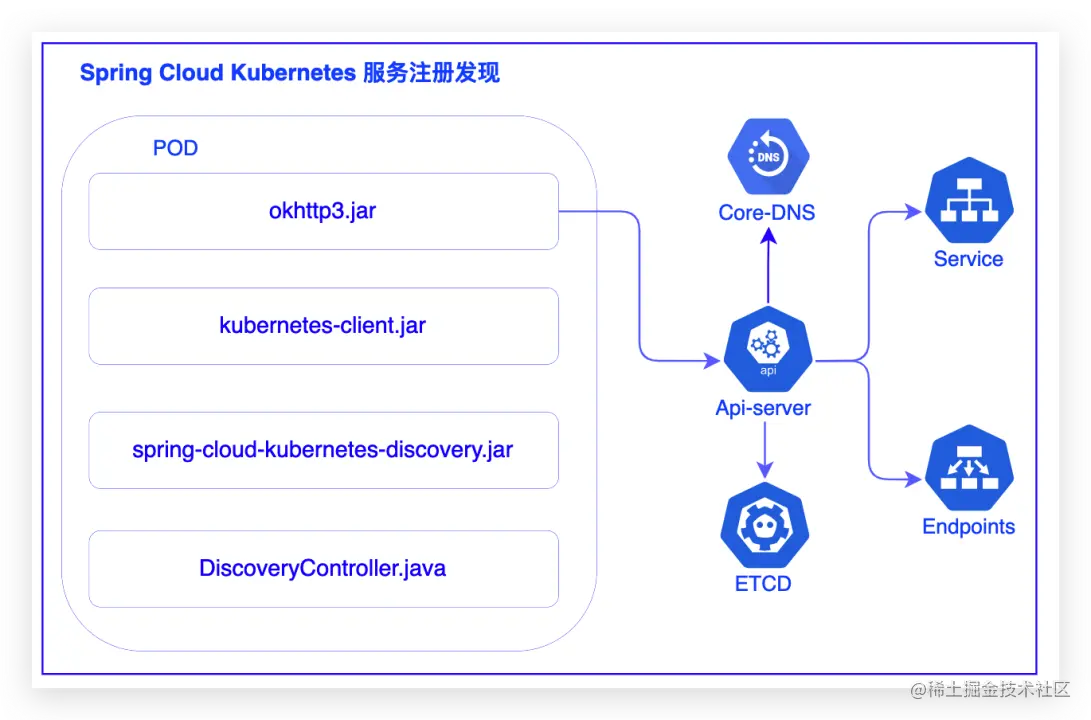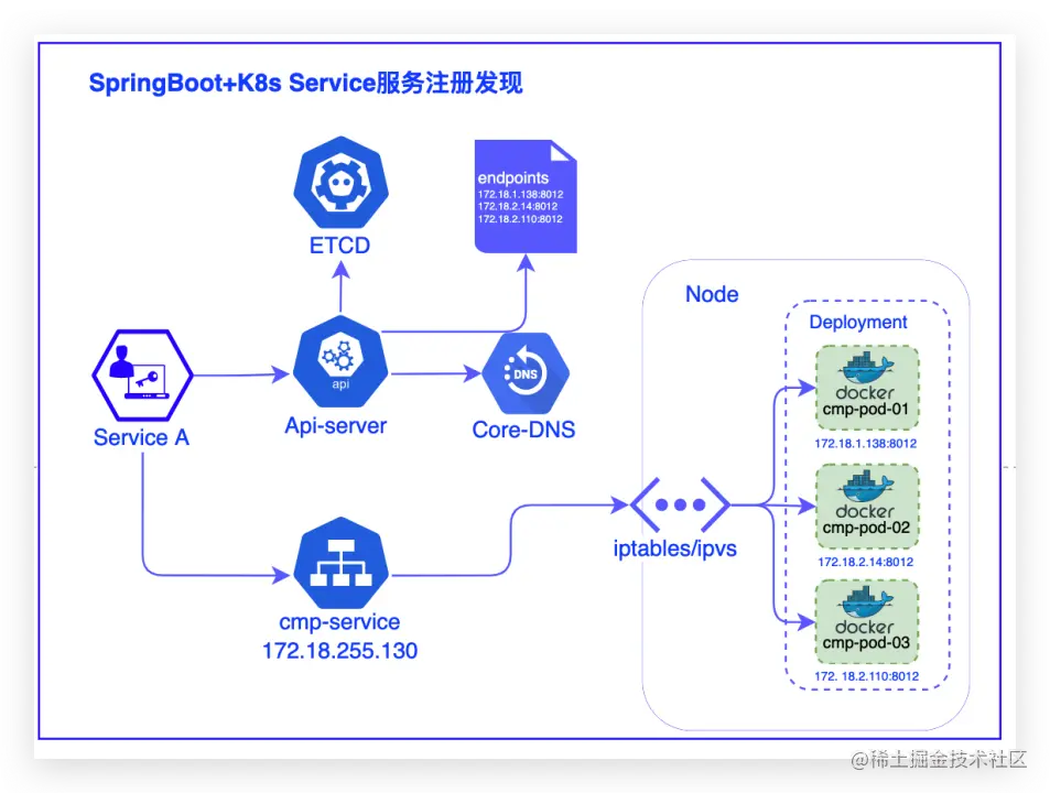 服务注册:spring Boot 应用配置有serivce的服务,启动后k8s集群针对调用该service,后端会返回具体的pod列表。