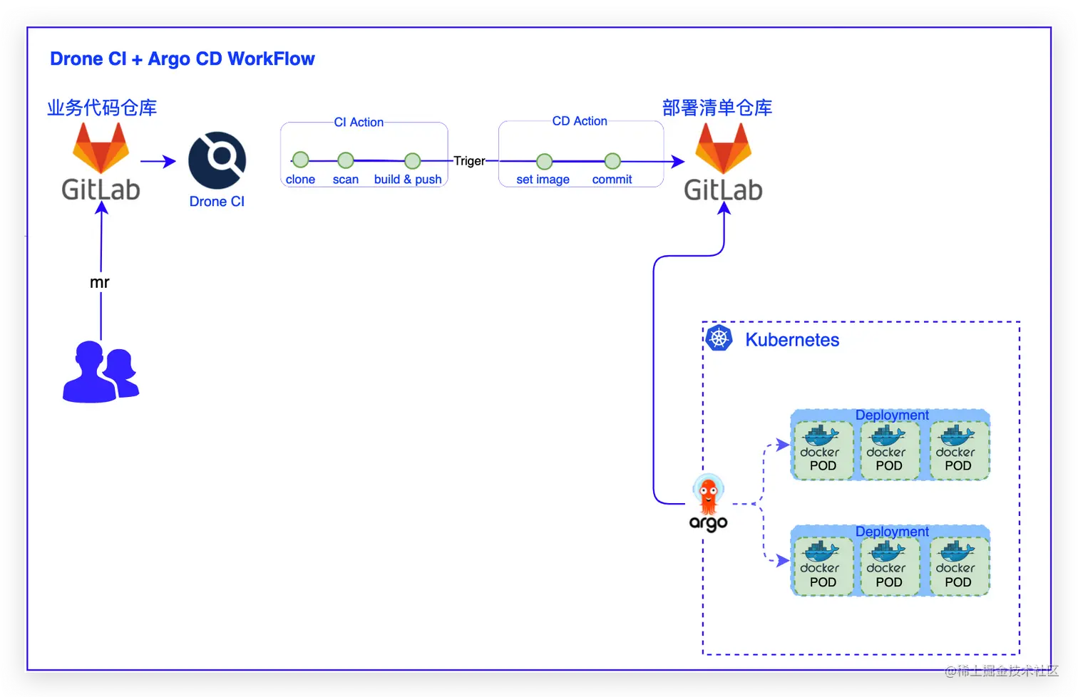 利用基于 Kubernetes 的声明式 Gitops 持续部署工具Drone CI + Argo CD,可以应用定义,配置和环境变量管理均基于云关上管控,代码仓库及配置资源声明清单也都存储在代码仓库受版本管理,应用发布及生命周期管理自动化,可审计。