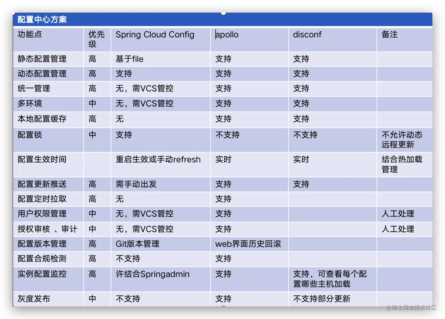 以下列出了一些其他配置中心的功能点对比。