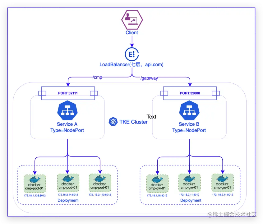 - NodePort:利用TKE负载均衡的NodePort,实现从LB流量转发到K8s集群内部,实现流量接入;