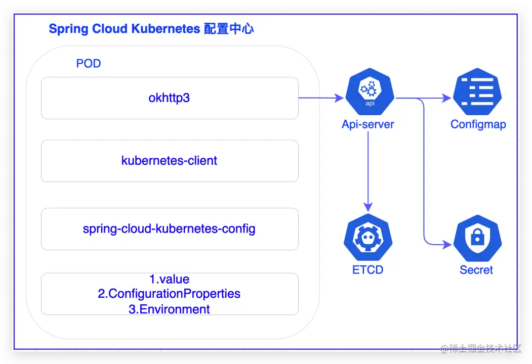 Spring Cloud Kubernetes 配置中心方案简介:spring-cloud-starter-kubernetes-config是spring-cloud-starter-kubernetes下的一个库,作用是将kubernetes的configmap与SpringCloud Config结合起来。