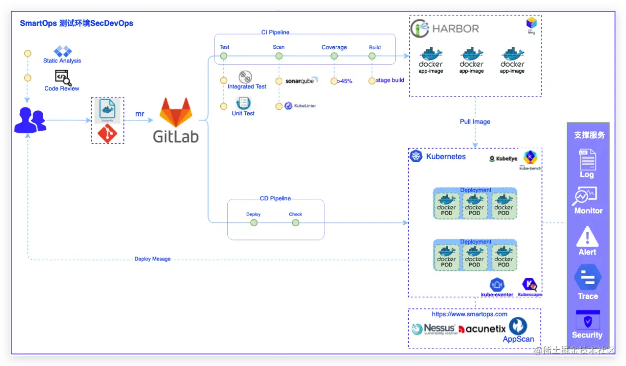 - 业界主流安全工具平台赋能:如:KubeLinter/Kubescape/Nessus/Sonarqube/AppScan等,严格把控平台从设计、开发、测试、部署、上线、运维等各流程安全,将SecDevOps贯彻在平台生命周期中,确保平台他安全性;