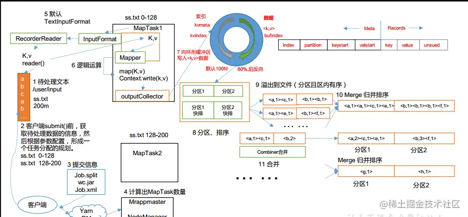 7.outputCollector输出收集器,向环形缓冲区写入数据,其实就是一块内存,一半用于存数据(key;value),另外一半存索引(描述数据的元数据,index为索引;partition为分区;keystart指key在内存存储在什么位置;valstart指value在内存存储在什么位置)。outputCollector默认大小100M。当写入80%的数据后(为什么80%是因为可以边接收数据边往磁盘溢写数据),开始反向写,把数据溢写到磁盘