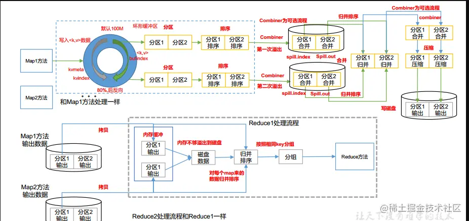 首先,通过getPartition获取是哪个分区。标记分区后,进入环形缓冲区。一半用于存数据,另外一半存索引。当写入80%的数据后,就会反向溢写。在溢写之前会将缓冲区的数据进行排序。之后可以进行Combiner(可选)。然后进行多次溢写,一个是spill.index(索引),一个是Spill.out(数据)。之后对所有溢写到磁盘的文件进行归并排序。之后可以进行Combiner(可选)。之后可以设置压缩(提高传输效率)。之后数据写到磁盘上,等待reduce拉取数据。