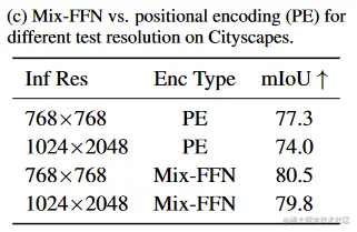 Table 1c shows the results for this experiment. As shown, for a given resolution, our approach using Mix-FFN clearly outperforms using a positional encoding. Moreover, our approach is less sensitive to differences in the test resolution: the accuracy drops 3.3% when using a positional encoding with a lower resolution. In contrast, when we use the proposed Mix-FFN the performance drop is reduced to only 0.7%. From these results, we can conclude using the proposed Mix-FFN produces better and more robust encoders than those using positional encoding.