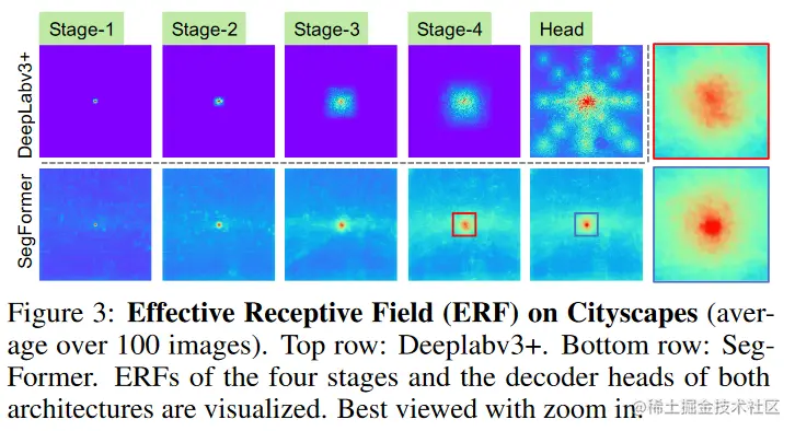 但是对于Transformer encoder来说,由于 self-attention存在,有效感受野变得非常大,因此decoder 不需要更多操作来提高感受野(作者试了一堆分割头,基本没有提升),下面是deeplab和segformer有效感受野可视化的对比(有效感受野:Understanding the Effective Receptive Field in Deep Convolutional Neural Networks)