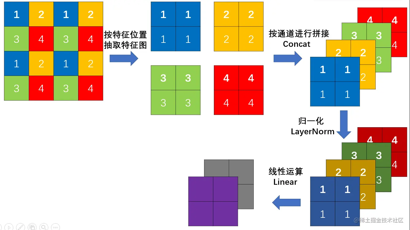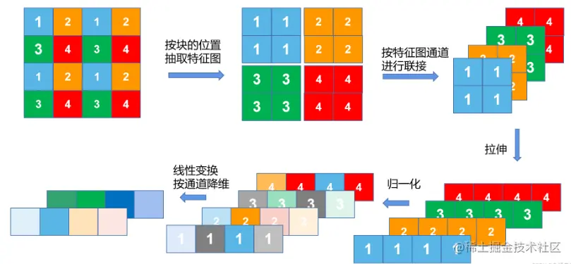 它无法保持这些patch的局部连续性,因此文中使用K=7,S=4,P=3以及K=3,S=2,P=1的overlapping patch merging