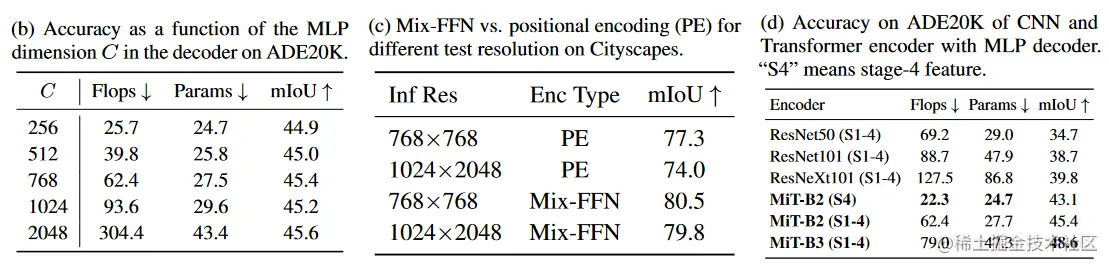如图所示,对于给定的分辨率,使用Mix-FFN的方法明显优于使用位置编码的方法。此外,我们的方法对测试分辨率的差异不那么敏感:当在较低分辨率使用位置编码时,精度下降3.3%。相比之下,当我们使用建议的Mix-FFN时,性能下降仅为0.7%。根据这些结果,我们可以得出结论,使用所提出的Mix-FFN比使用位置编码产生更好和更健壮的编码器。